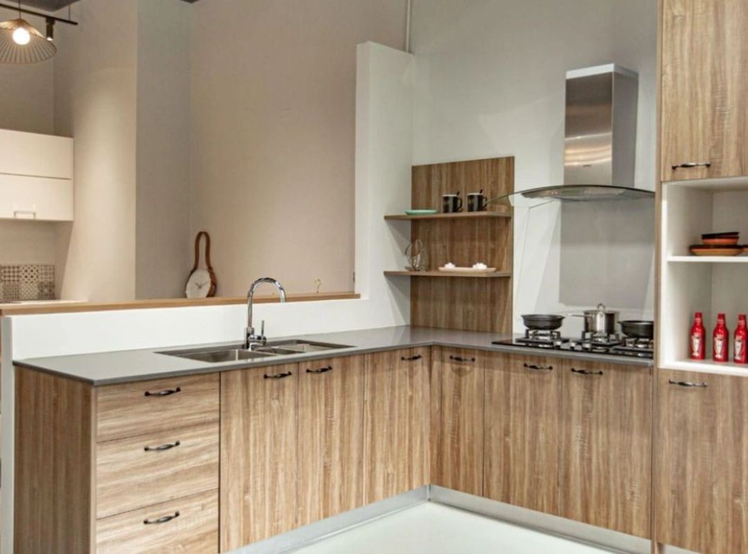 - Tủ bếp và kệ mở sử dụng ván ép sáng màu